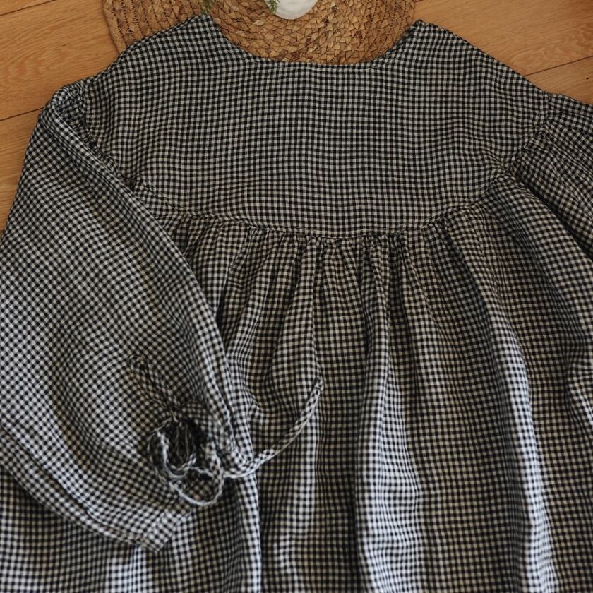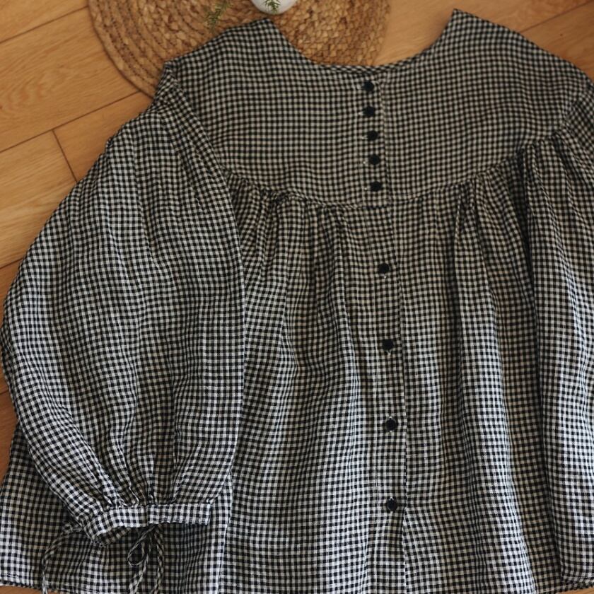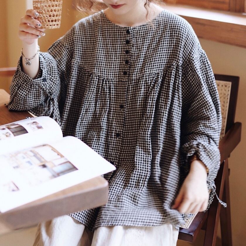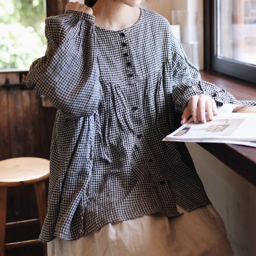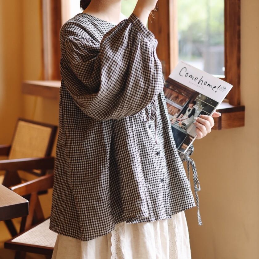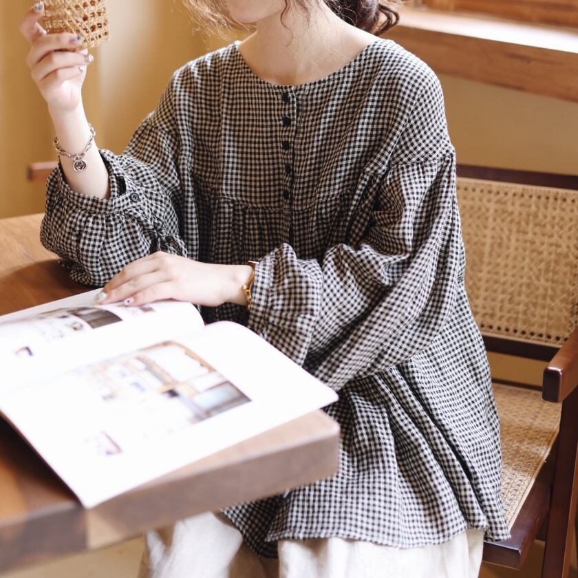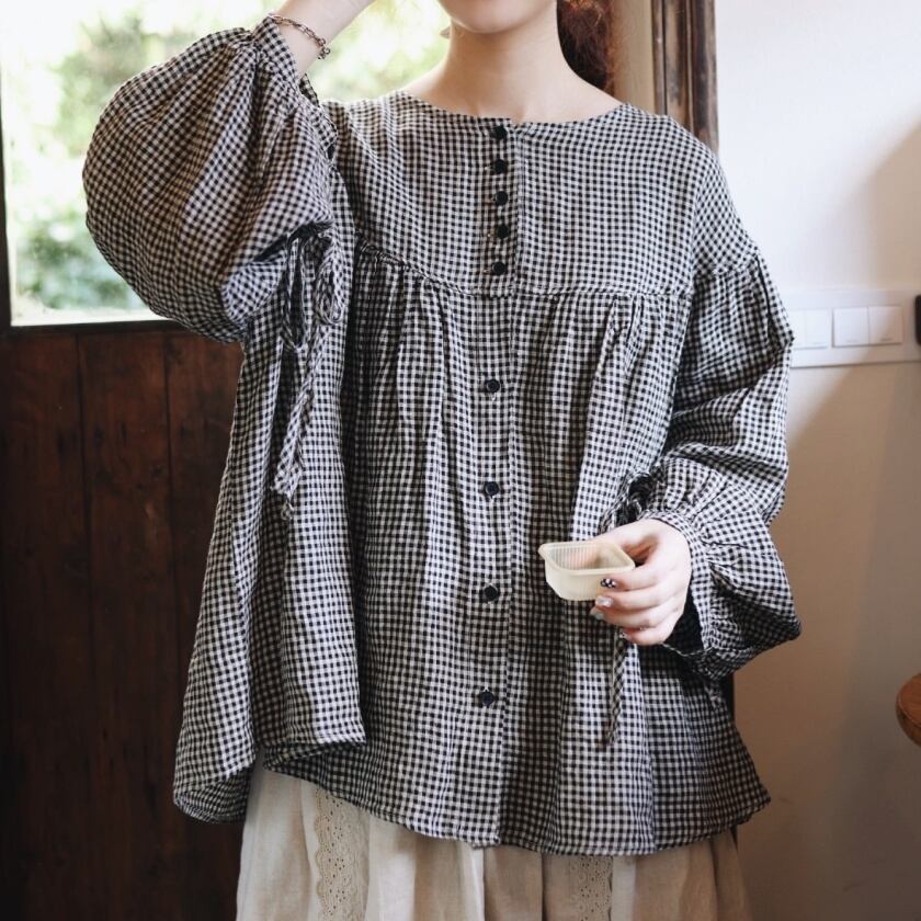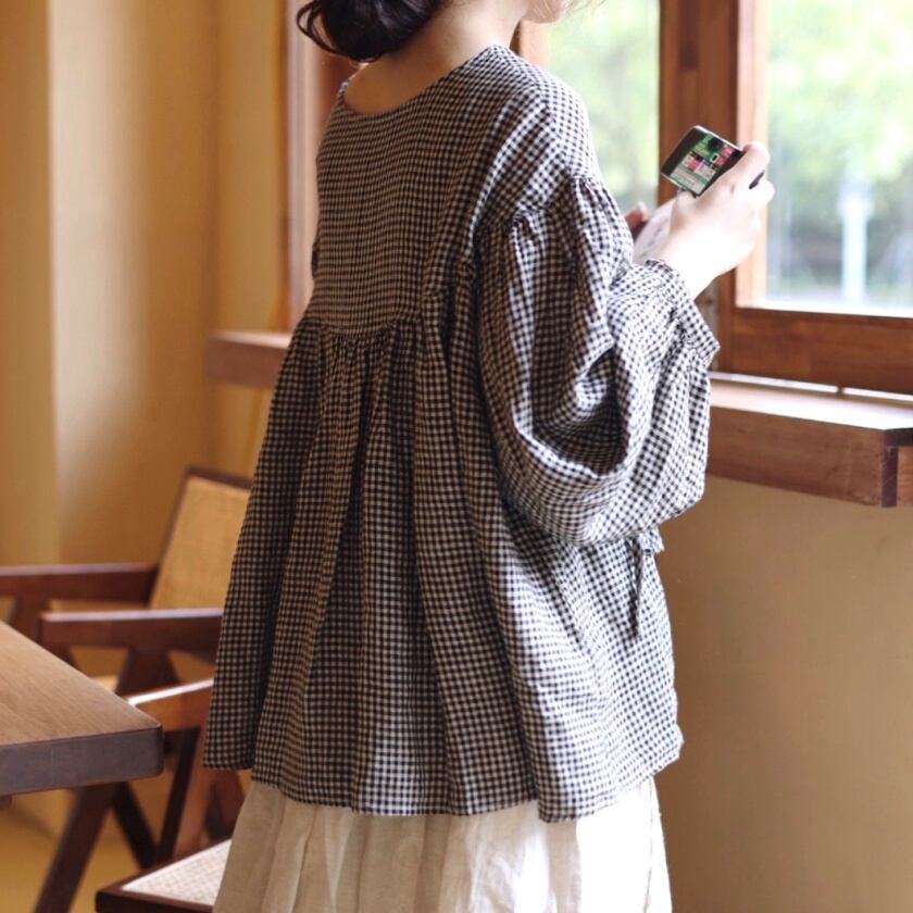 ギンガムチェックバルーンスリーブブラウス T0050