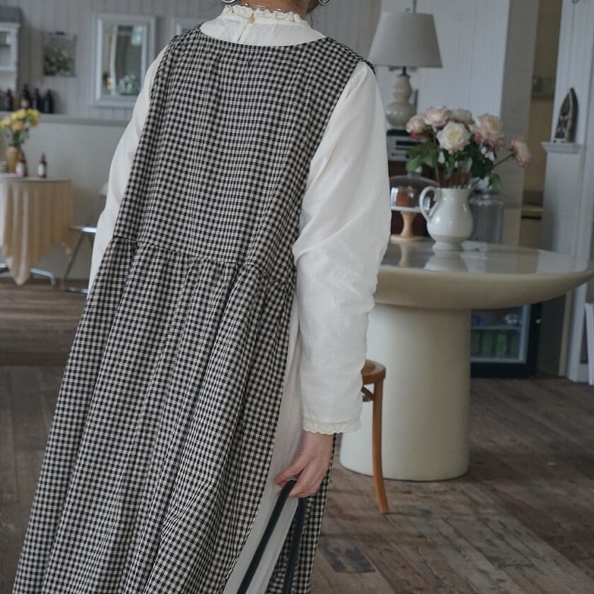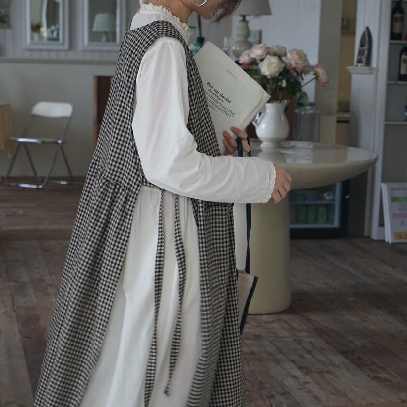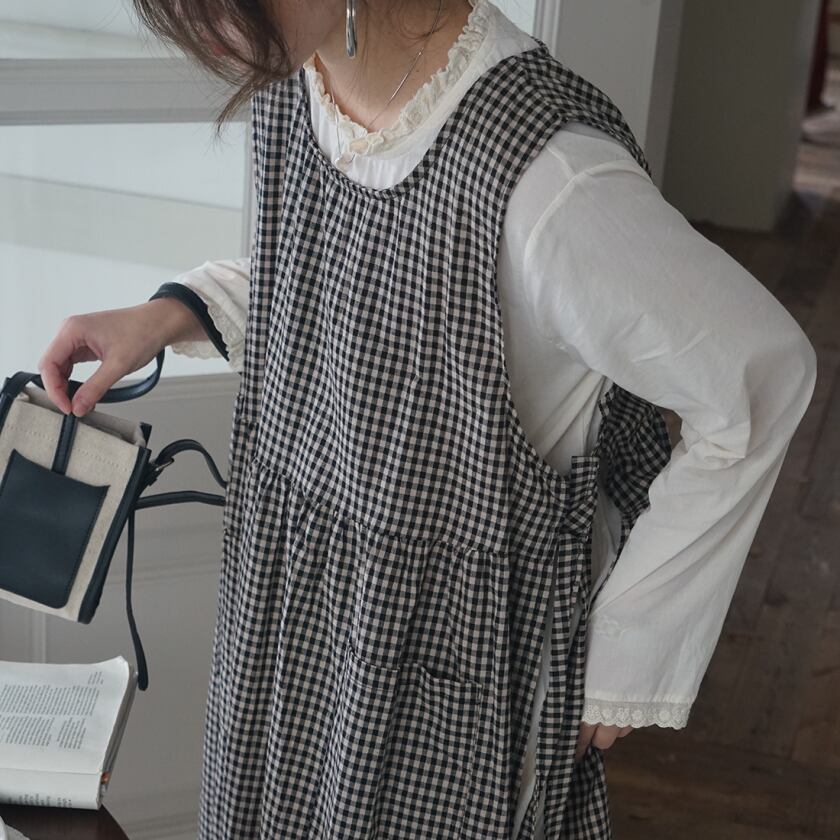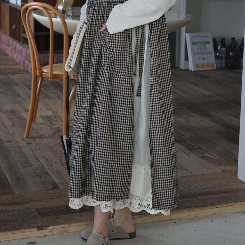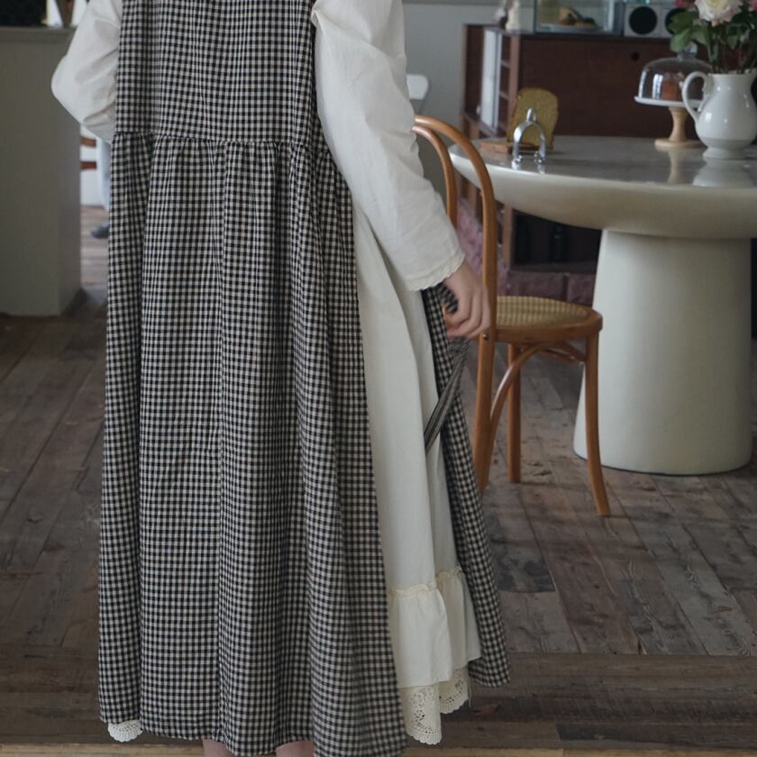 チェックエプロンワンピース×レーストリムワンピース T0359