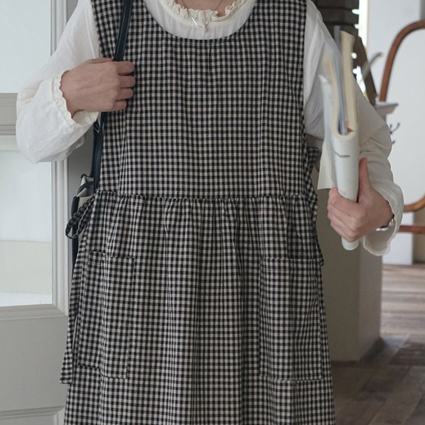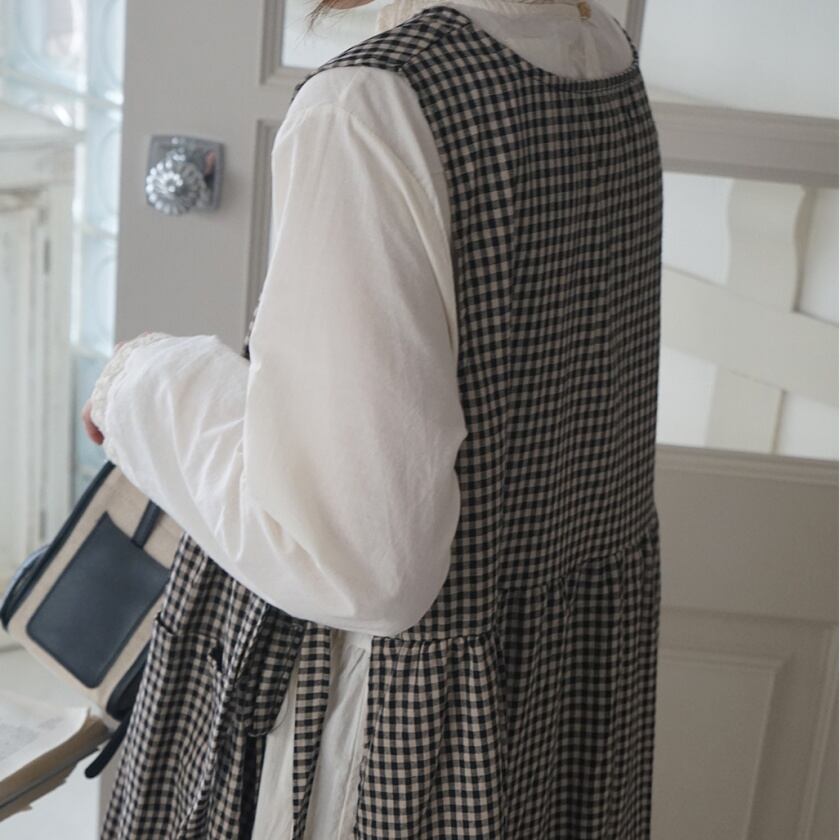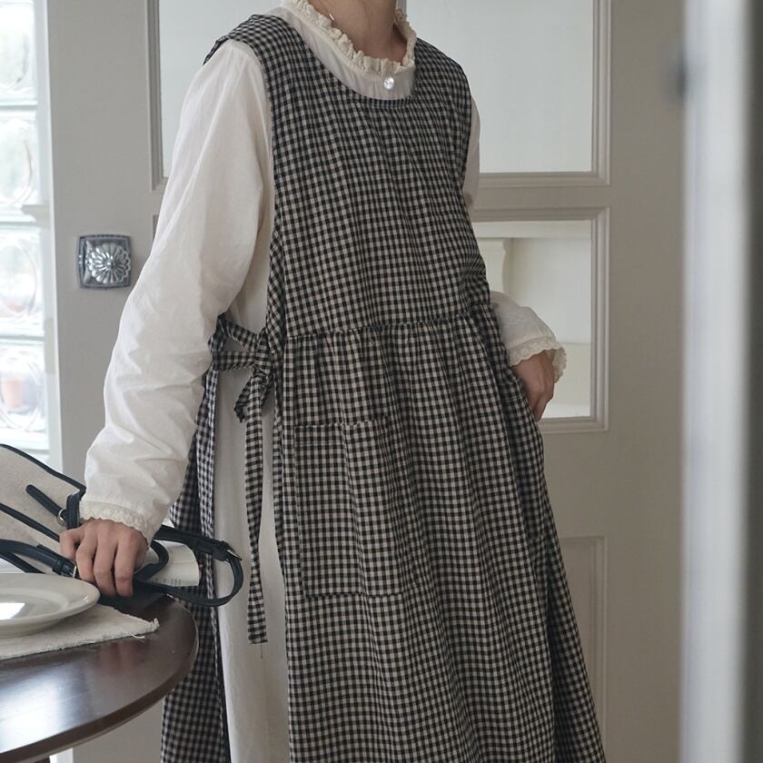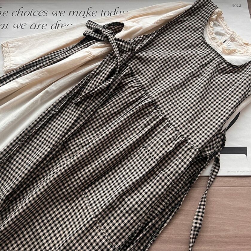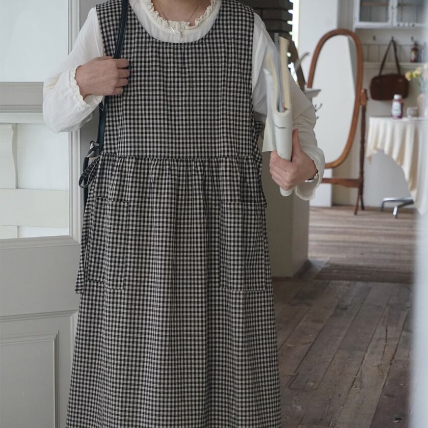 チェックエプロンワンピース×レーストリムワンピース T0359