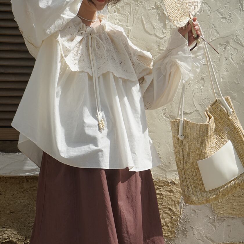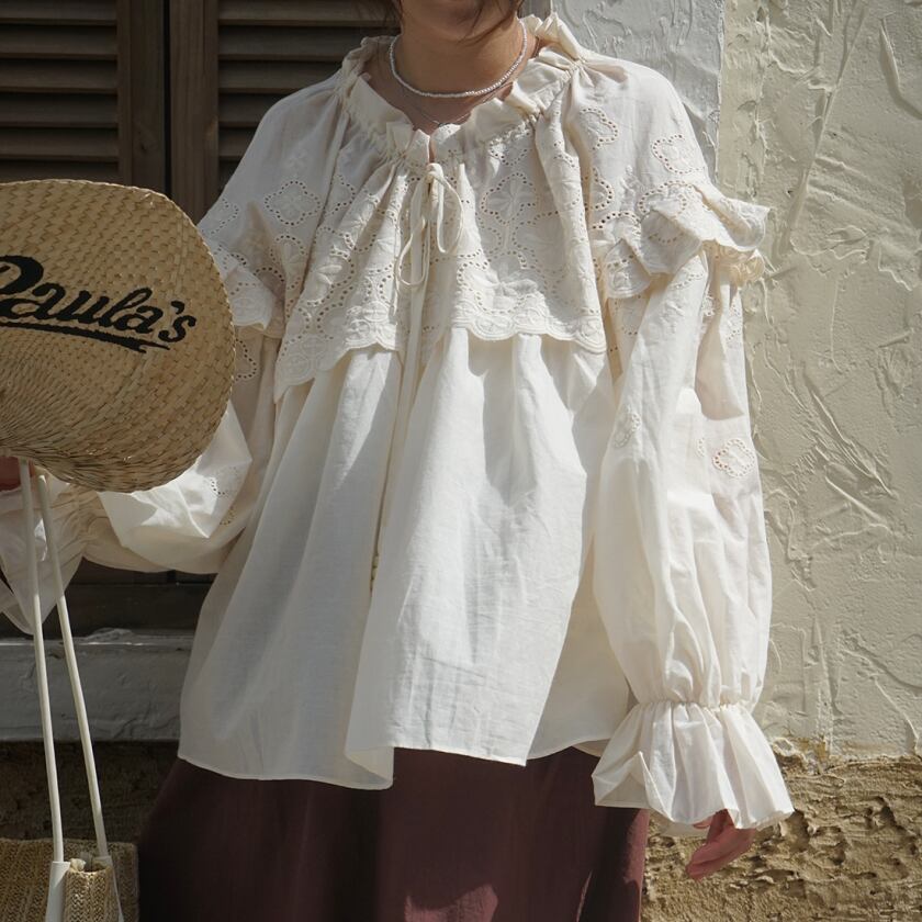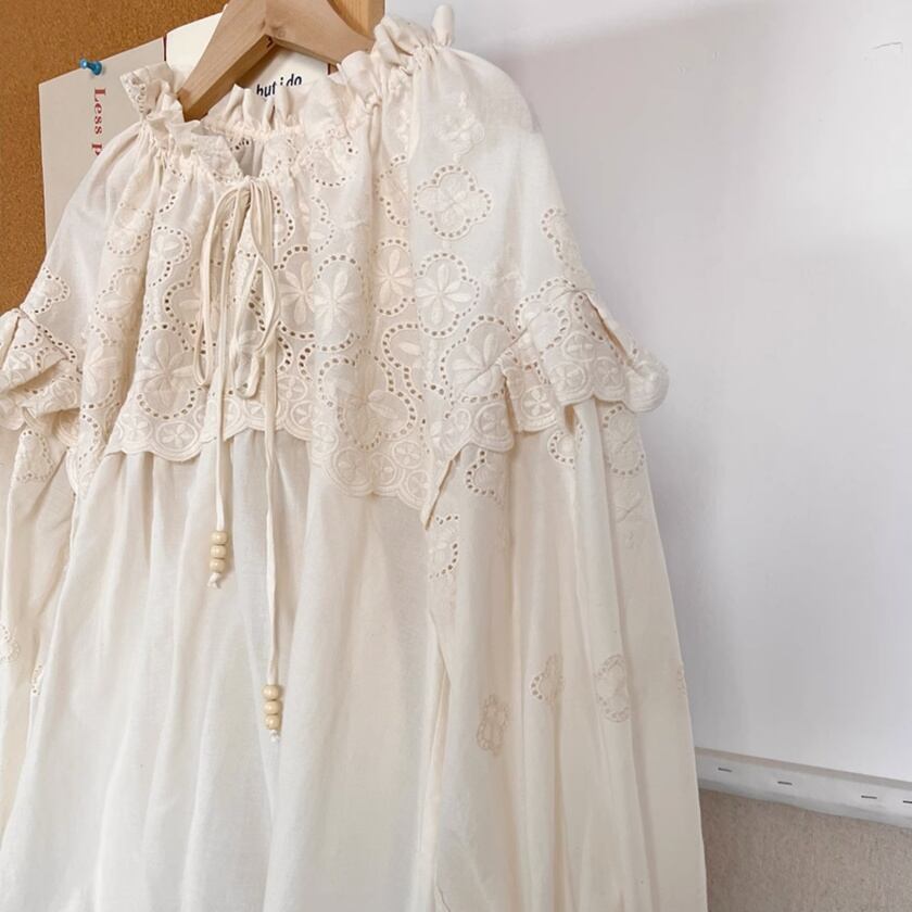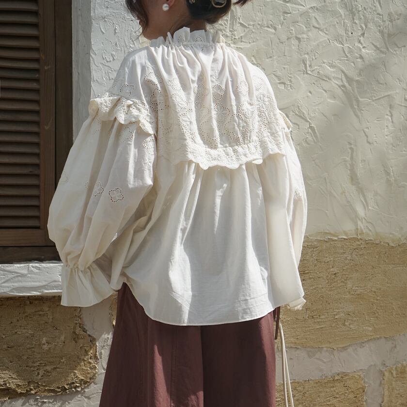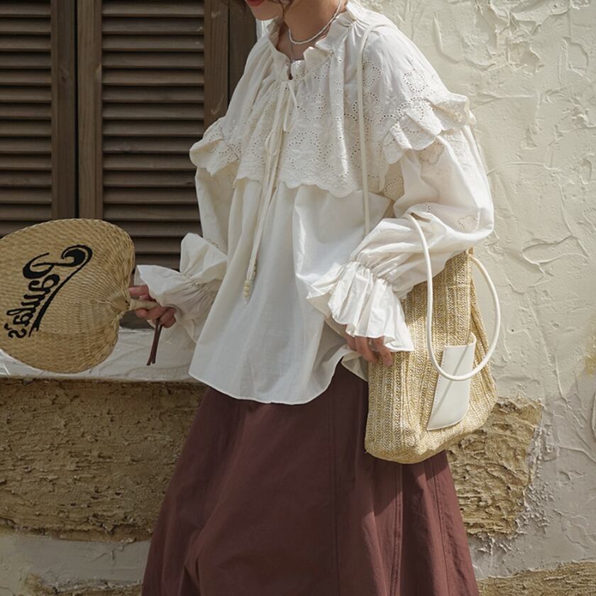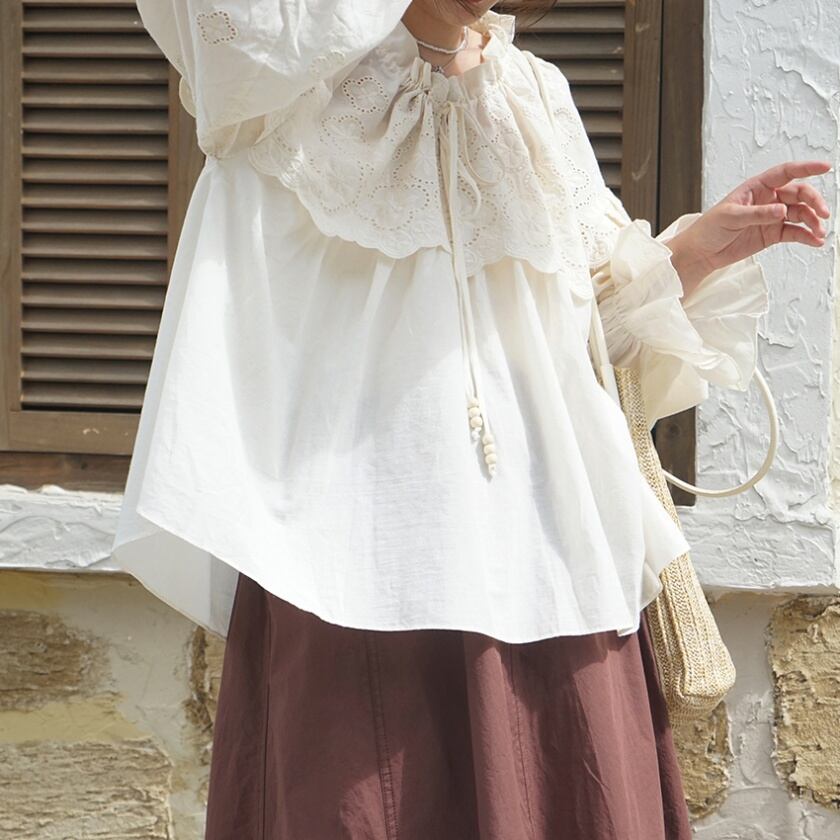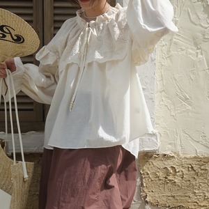フリルレースドロストネックブラウス T0378